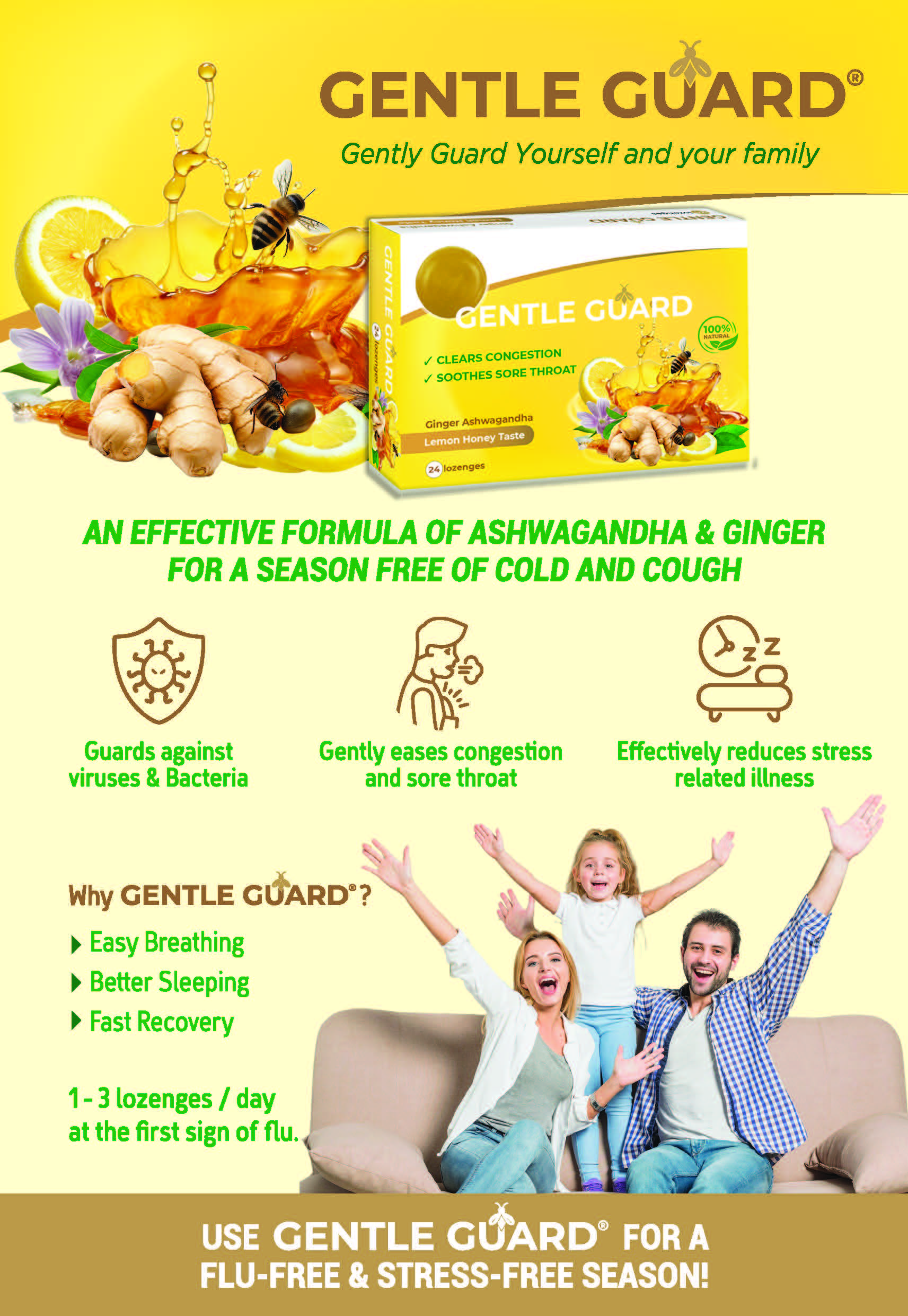 This gets to the root of the problem Since Ginger & Ashwagandha have synergistic effect to reduce Inflammation thus easing sore throat and airway irritation. Furthermore, this combination works together for immune support by their adaptogenic effect (reducing cortisol, stress factor) enhancing the body’s ability to fight against viruses and bacteria. In addition, Ginger works as decongestant, reduces chills and body aches commonly associated with Flu. On the other hand, Ashwagandha helps restore energy post-flu by improving stamina and energy. Gentle Guard® thus relieves sore throat, congestion and promotes immune balance, recovery & energy.