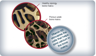 • K2 vitamins are required in order to utilize calcium to make bone matrix healthy. K2 vitamins activate a protein involved in the bone builing process, namely osteocalcin, which is capable of binding calcium to the mineral part of bone, thus strengthening the skeleton.