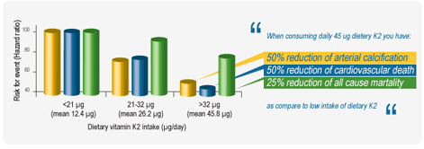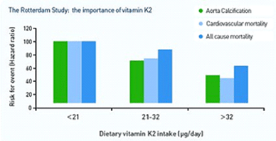 The Rotterdam study (4,800 elderly people were followed up for 10 years) demonstrated that when consuming 45μg of vitamin K2 daily one has 50% reduction of arterial calcification, 50% reduction of cardiovascular death and 25% reduction of all-cause mortality, compared to low intake of dietary k2.